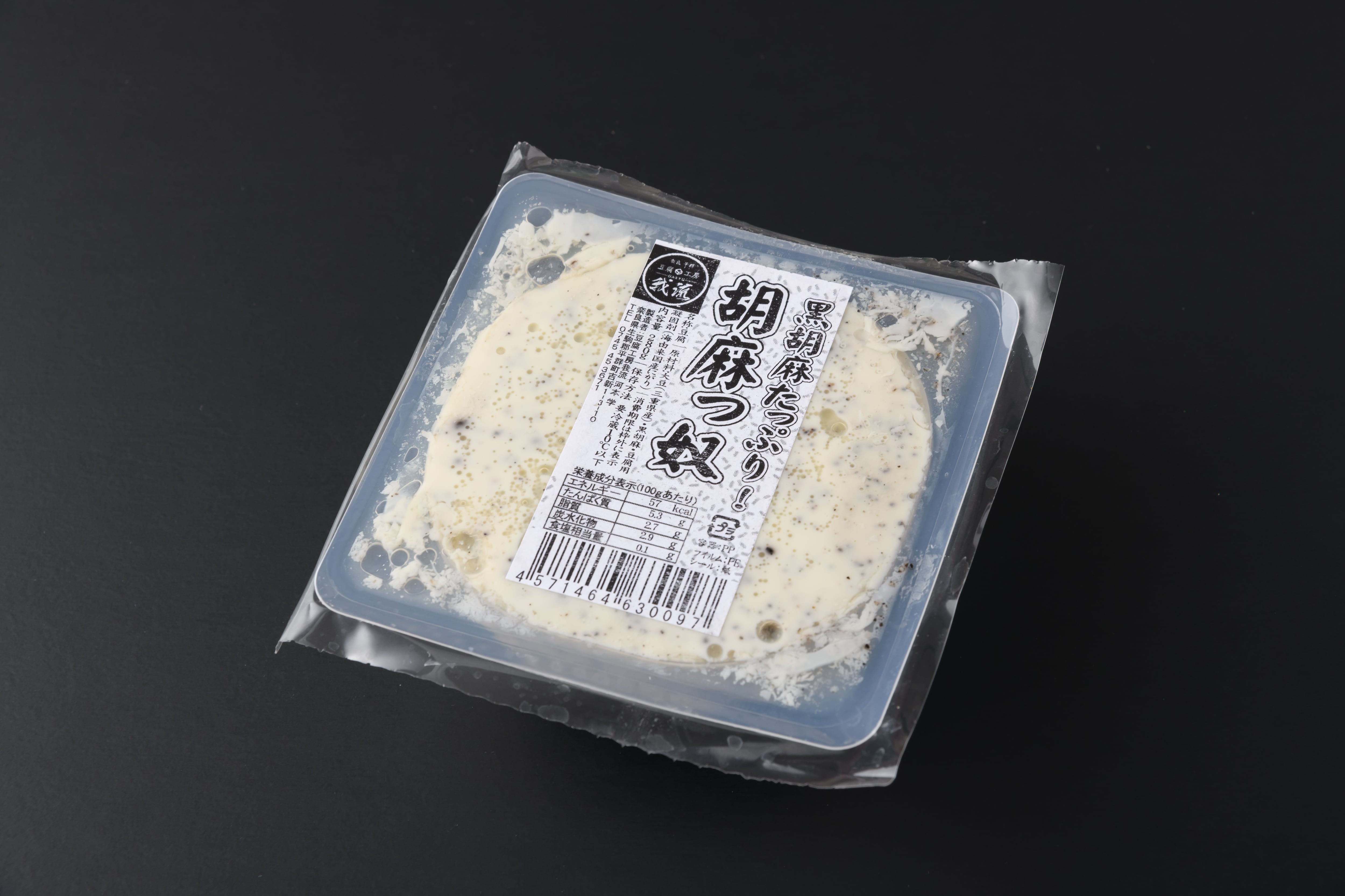 白宝に黒すり胡麻を合わせた豆腐です。充填の強みである密封製法で、大豆と胡麻の風味が見事にコラボしています。ドレッシングとの相性もバッチリで、サラダに最適です。