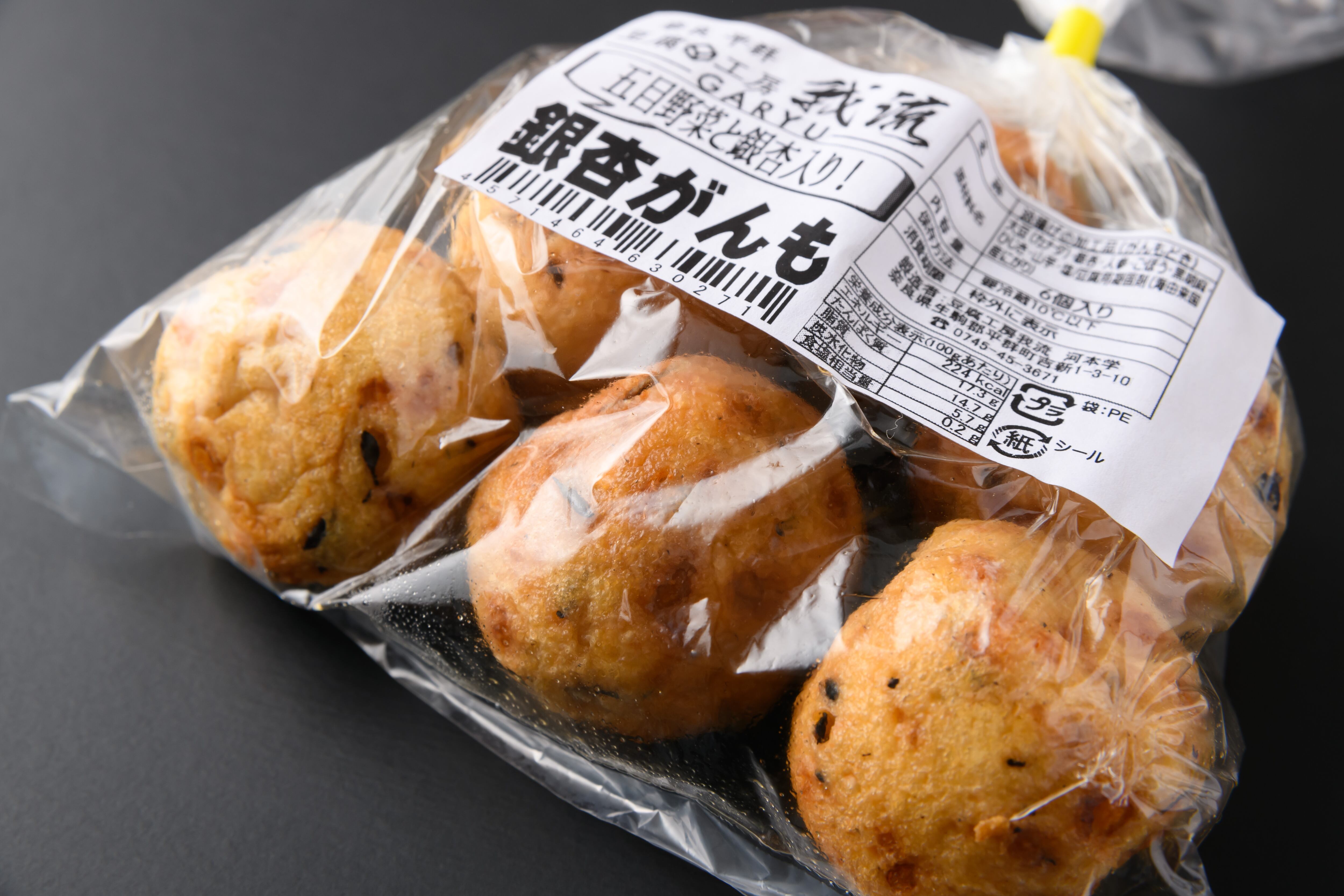 五目野菜と銀杏の入った一口サイズのがんもどきです。お大根を炊くように(一緒に炊いていただいても)ゆっくり煮詰めてやるとひとまわり大きくなりお出汁たっぷり含んでくれます。